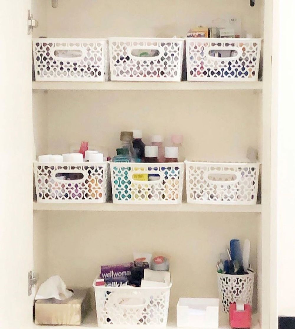She keeps the beauty products she uses every day in a special caddy, while everything else is neatly stacked in her medicine cabinet in cheap, categorized Poundstretcher baskets.