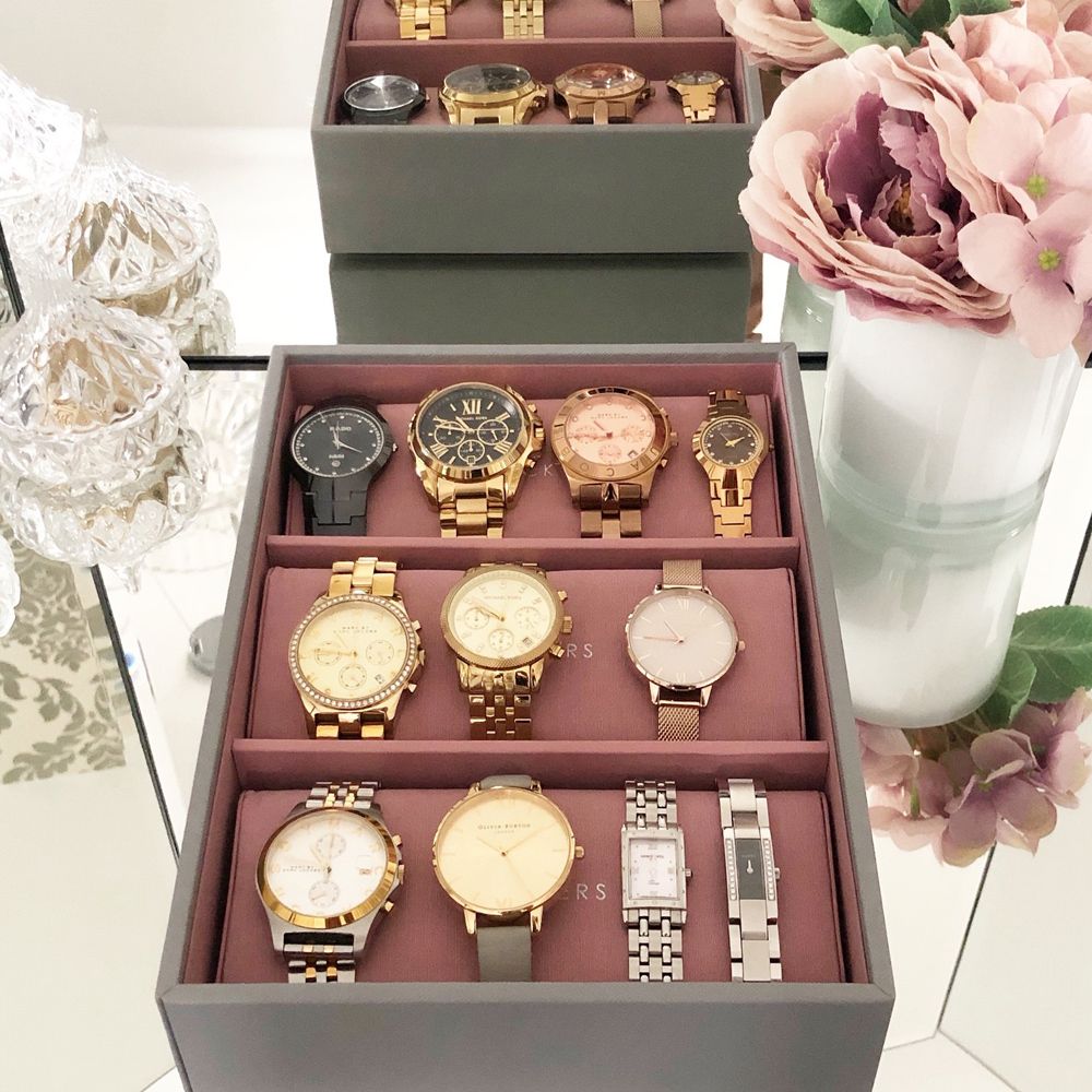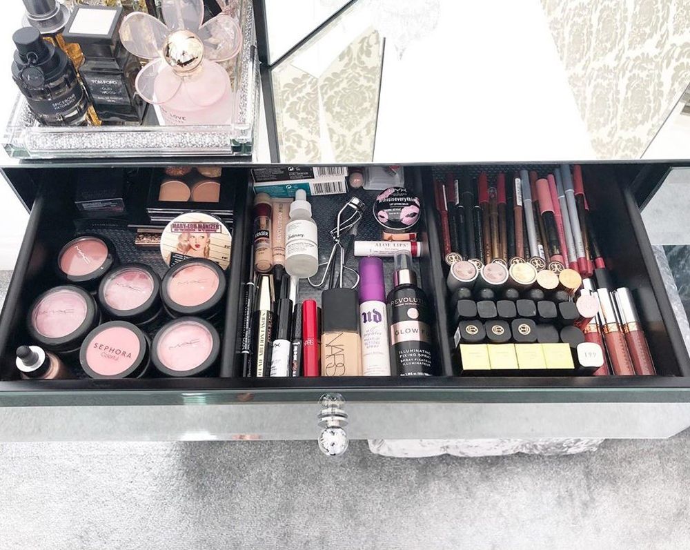 In her bedroom, her perfume collection is organized in height order and her jewelry is neatly stored in a tray, according to color and style.