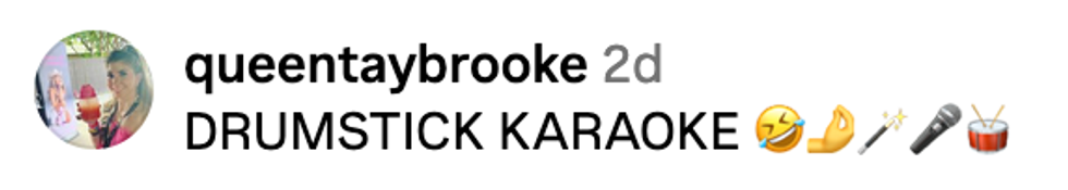 And now, she is the reigning champ of drumstick karaoke, and we're here for it.