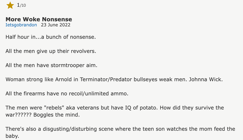 The following review from Terror on the Prairie's IMDb page is just one example of a conservative accusing the far-right darling of making a "woke movie."