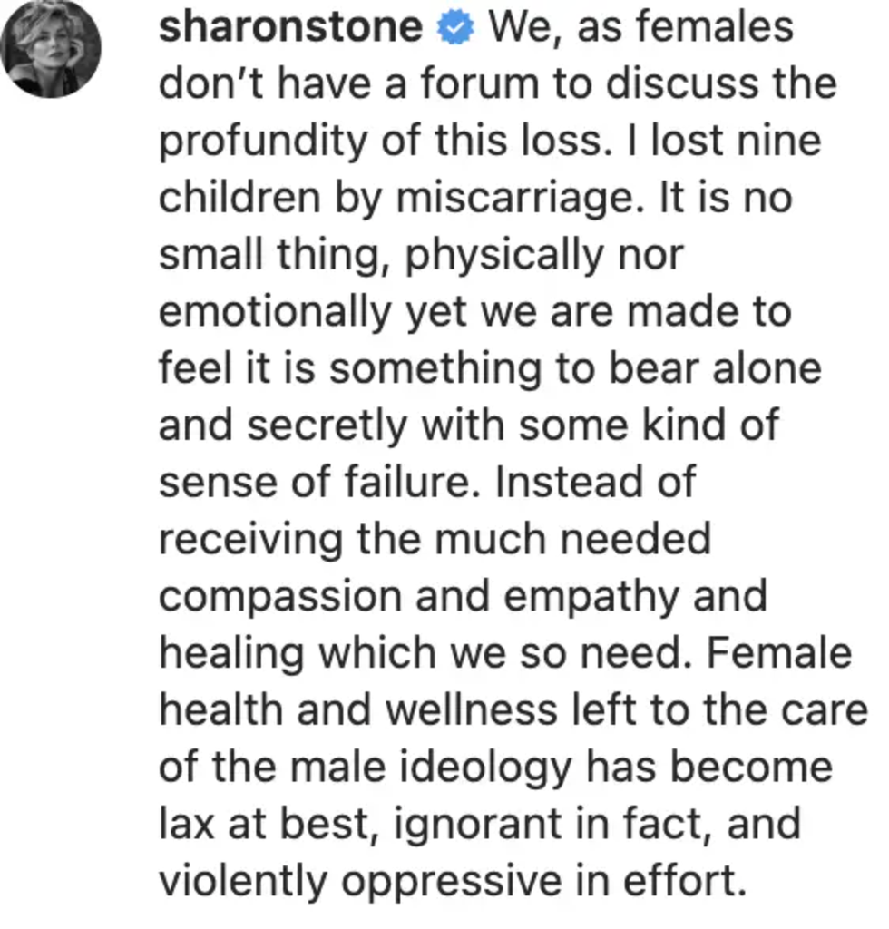 \u201cI, in the past, endured 17 miscarriages over the course of 12yrs, & I can truthfully say, each time & collectively, they were the most devastating & emotionally painful thing I'd been thru. I agree with Sharon Stone. \ud83e\udd7a\ud83d\ude22\u201d— \ud835\udd7e\ud835\udd8d\ud835\udd8a\ud835\udd91\ud835\udd91 \ud83c\udf0a~\ud83d\ude4f\ud83c\udffePray for Peace, Justice, & Mercy (@\ud835\udd7e\ud835\udd8d\ud835\udd8a\ud835\udd91\ud835\udd91 \ud83c\udf0a~\ud83d\ude4f\ud83c\udffePray for Peace, Justice, & Mercy) 1656195179
