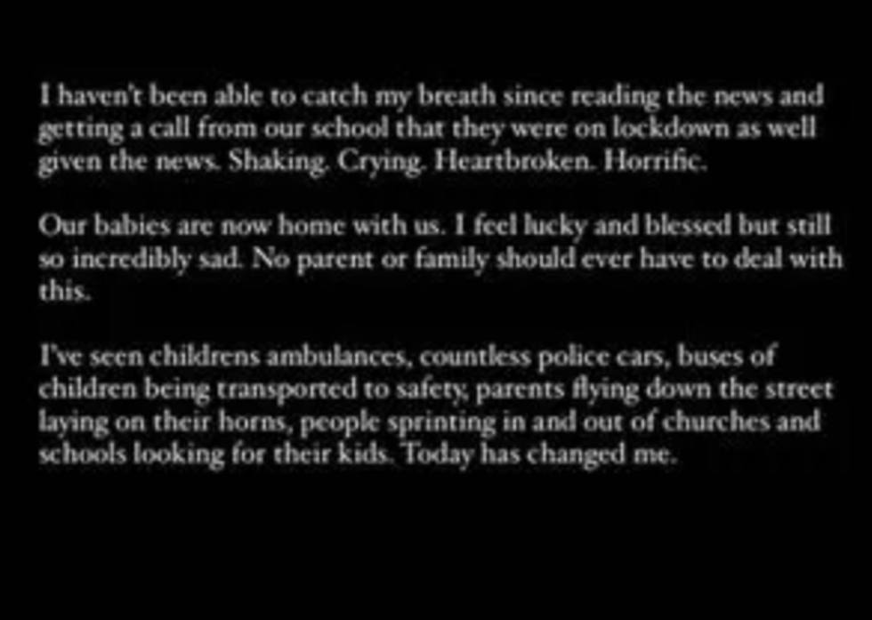 "All of us calling our own schools to check in. Learning that every school was also under lockdown. Racing to pick up our own babies just to have them home and close."