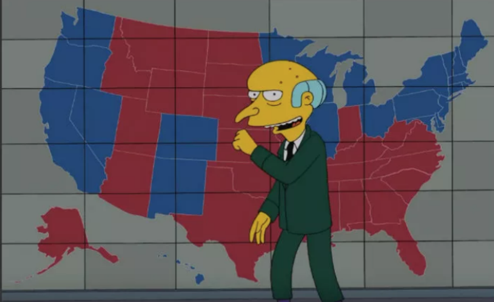 This was also a hoax. Though the video this screenshot came from was directly related to the 2016 elections, it had far more to do with Mitt Romney than with Donald Trump. In the video, Mr. Burns endorses Mitt Romney for President and shows the audience the classic red and blue electoral map. But when compared to the actual map from 2016 (which resulted in a Trump victory), it's clear Burns was off on several fronts. Wisconsin, Ohio, Virginia, and Pennsylvania all fell in the opposite direction!