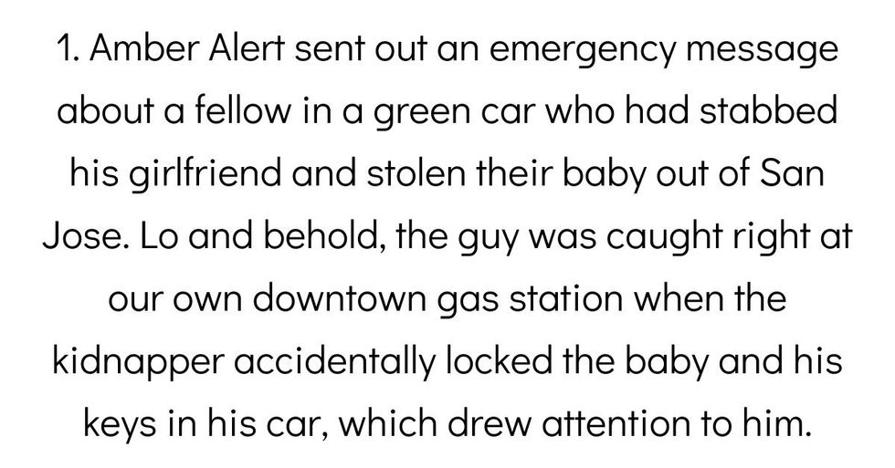 A few days ago, Amber Alert sent out an emergency message about a fellow in a green car who had stabbed his girlfriend and stolen their baby out of San Jose, which is 3 hours north of us. Lo and behold, the guy was caught right at our own downtown gas station when the kidnapper accidently locked the baby and his keys in his car, which drew attention to him. A good samaritan from an entirely different town, (a tourist), put the puzzle together, and put the guy in a headlock until the authorities arrived.