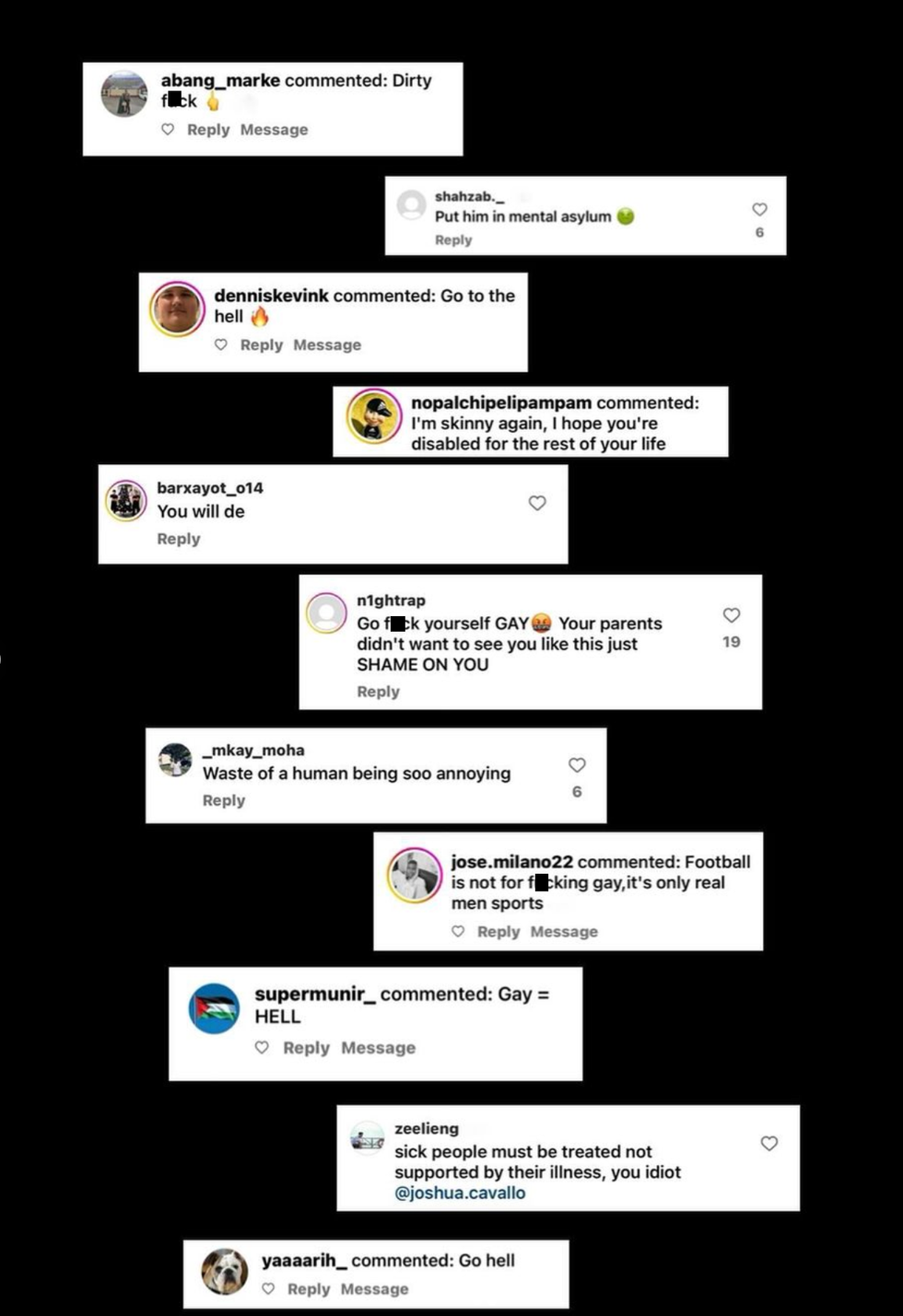 The 24-year-old A-League Men midfielder also shared screenshots of some of the vile comments he received from homophobic trolls, and encouraged social media platforms to "do better" to prevent the online bullying of LGBTQ+ people.