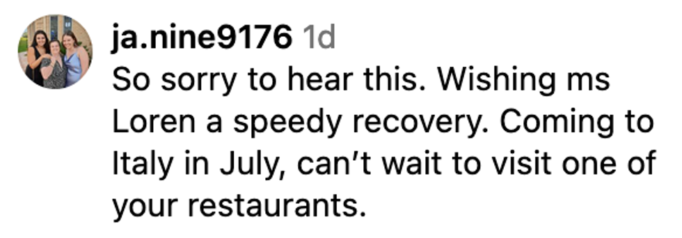 "The whole team at Sophia Loren Restaurant takes this opportunity to wish her a speedy recovery. #sophialoren @sophialorenrestaurant.”