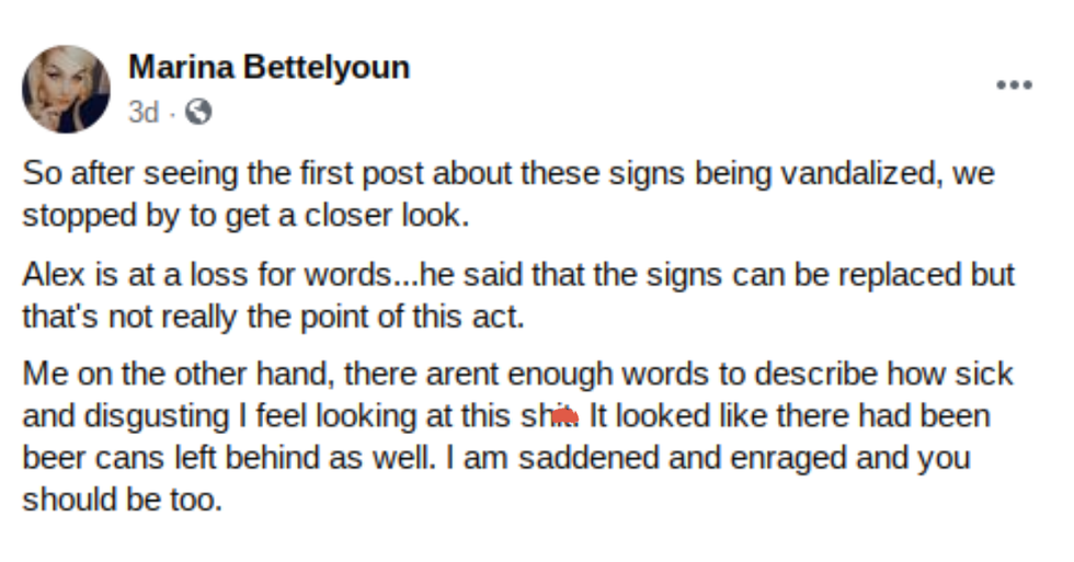 Pine Ridge resident Marina Bettelyoun took photos of the three desecrated signs and posted them to Facebook.
