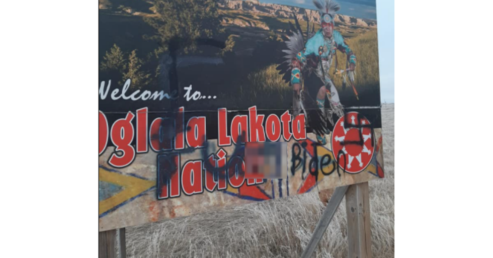 "These signs serve as our welcoming emblems to visitors and guests of the Pine Ridge Indian Reservation, and depict the pride we have for our culture and traditions as a sovereign nation. Over the past 24-hours, the signs have been spray-painted with a derogatory term involving President Joseph Biden, the letters 'KKK', and a swastika painted over our tribal flag."