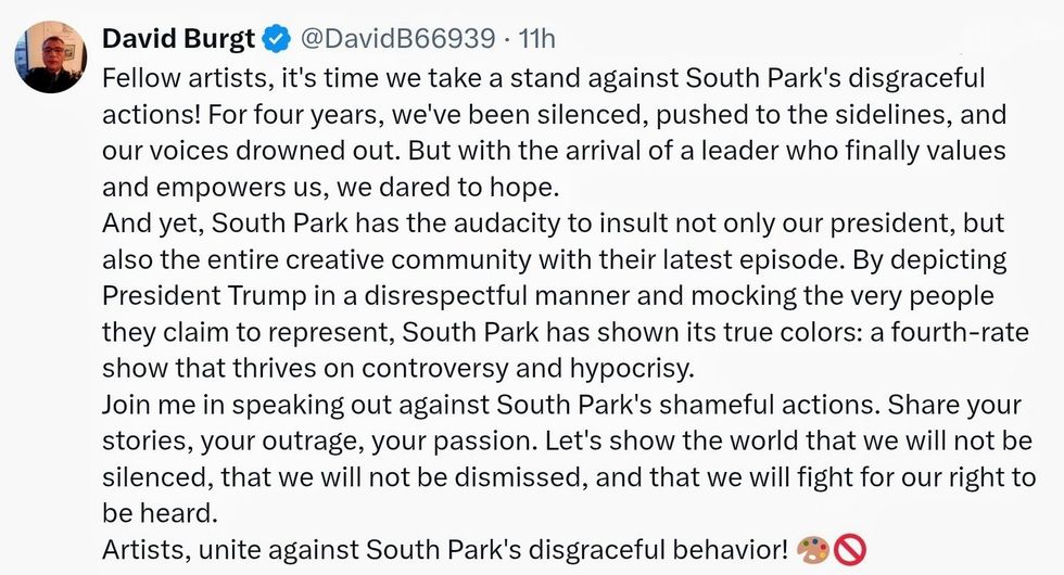 "The Left’s hypocrisy truly has no end—for years they have come after South Park for what they labeled as ‘offensive’ content, but suddenly they are praising the show."
