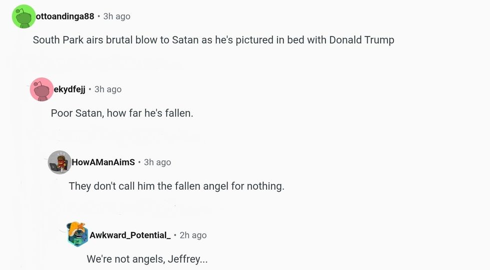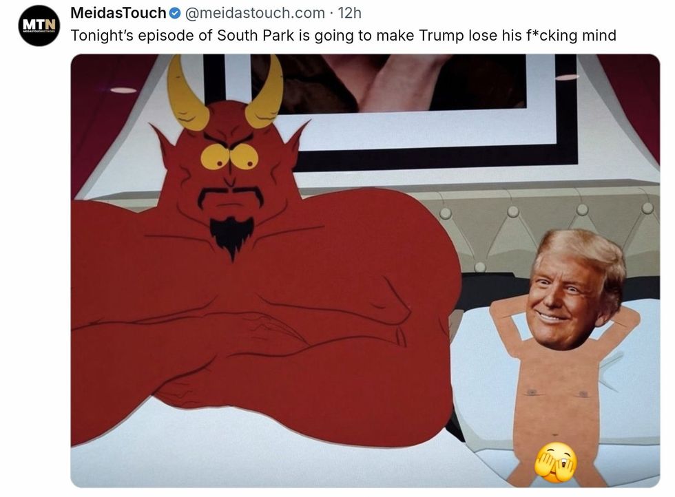 Longtime fans of the show will be disappointed to learn Satan—yes, King of Hell Satan—has gone back to another man who's no good for him. Satan left Saddam Hussein—an abusive and manipulative partner—with the help of Kenny in the movie South Park: Bigger, Longer & Uncut. After his relationship with gentle, caring Chris ended, Satan has gone back to another narcissistic liar—Donald Trump.