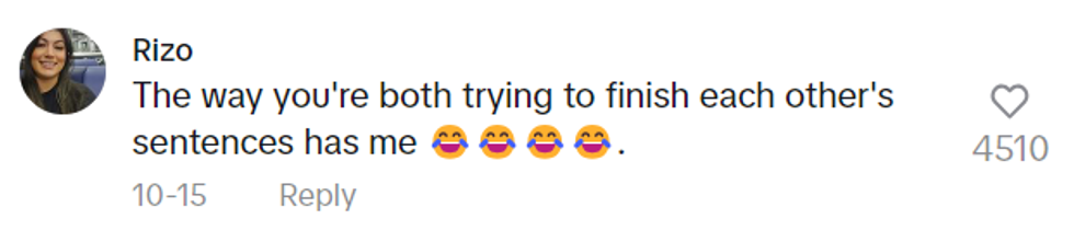 In a hilarious first video, the pair of TikTokers talk over one another and try to complete each others' sentences (badly) while shouting out common annoying catchphrases as fellow passengers eye—and decide to pass up—sitting with them.