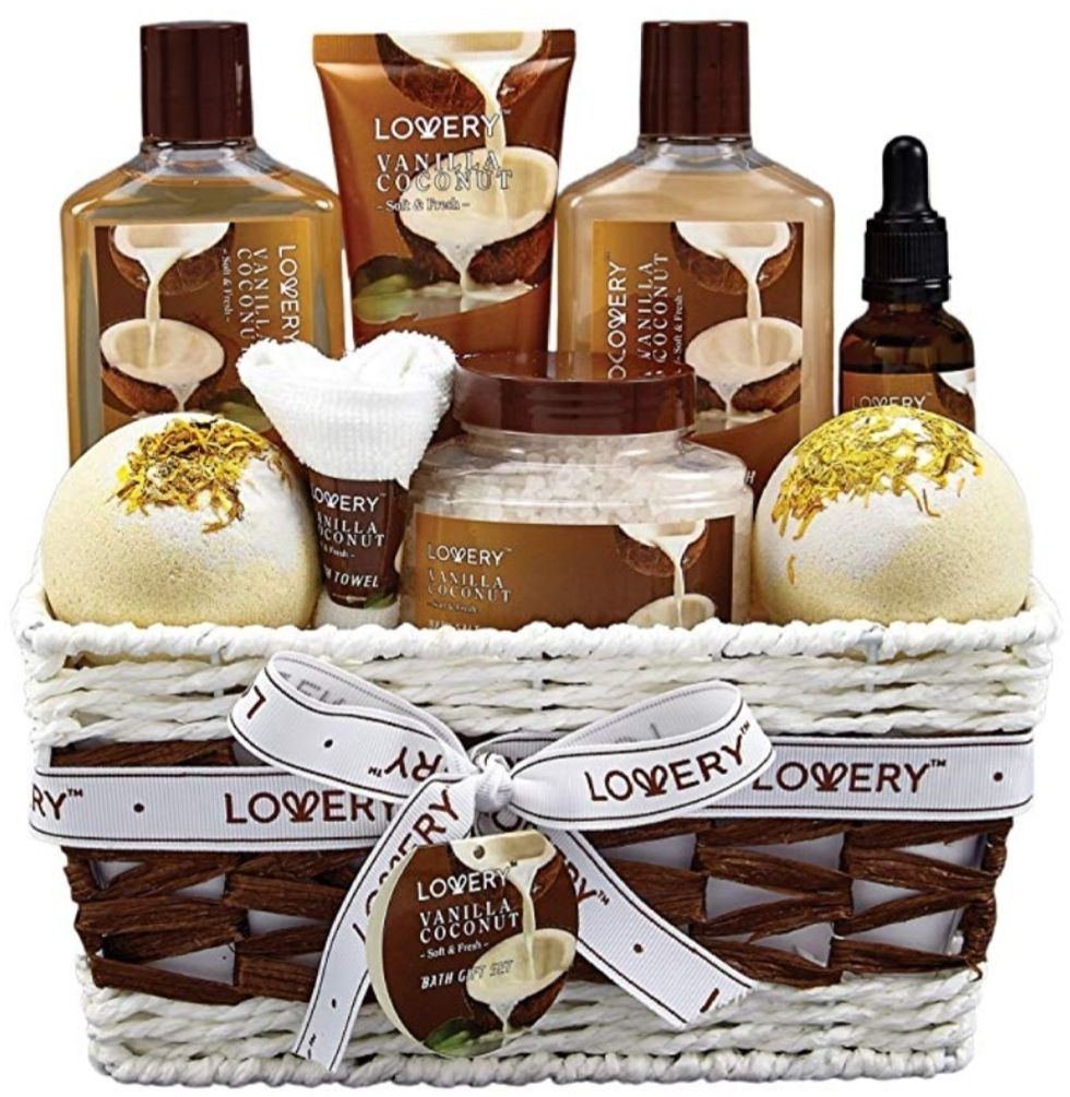 Set includes vanilla coconut Shower Gel, Bubble Bath, Body Scrub, Body Oil, 2 Large Bath Bombs, Bath Salt and a luxurious Bath Towel.