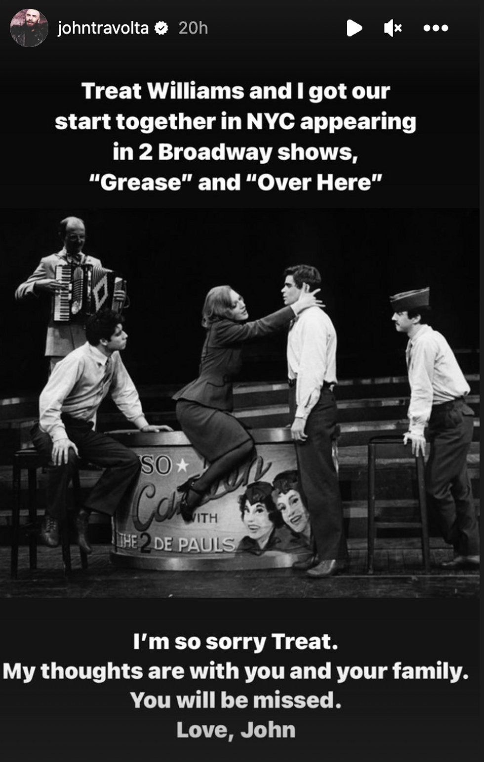 John Travolta also honored Williams via his Instagram stories, sharing he and Williams got their "start together in NYC" appearing in the Broadway shows Grease and Over Here.