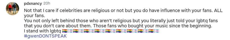 Bernstein quoted some of Stefani's lyrics, as did many in the comments on both videos, and the hashtags #DONTSPEAK and #GwenDONTSPEAK trended across social media.