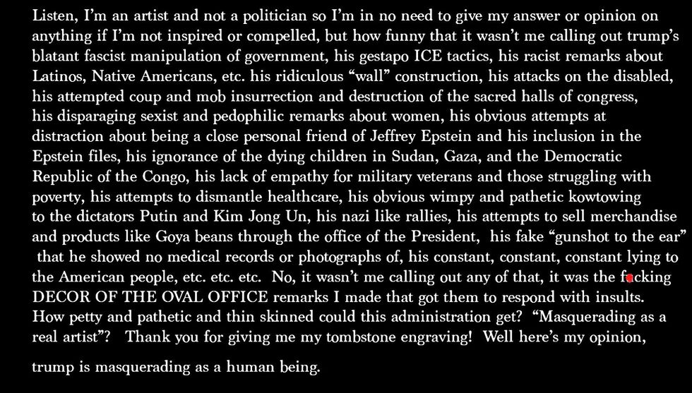 "How petty and pathetic and thin skinned could this administration get? 'Masquerading as a real artist'? Thank you for giving me my tombstone engraving! Well here's my opinion, trump is masquerading as a human being."