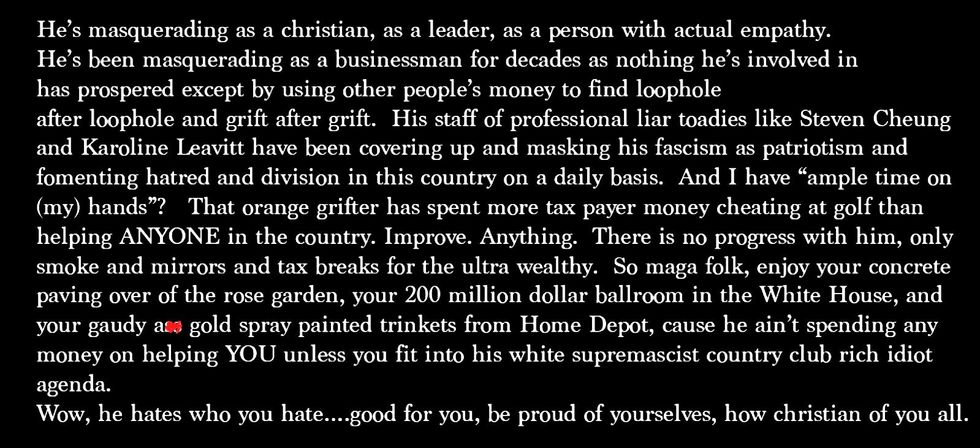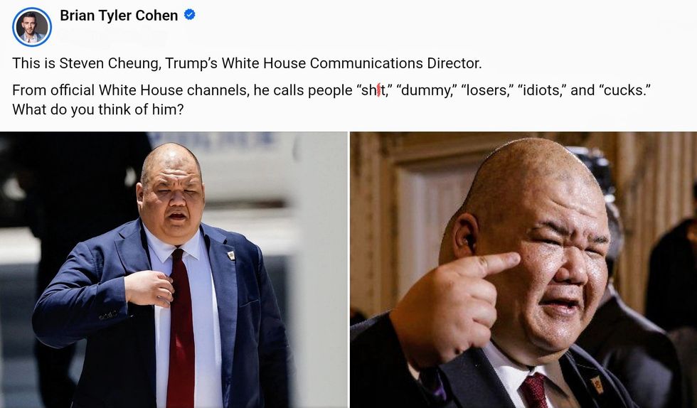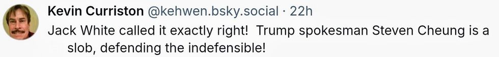 "His staff of professional liar toadies like Steven Cheung and Karoline Leavitt have been covering up and masking his fascism as patriotism and fomenting hatred and division in this country on a daily basis."
