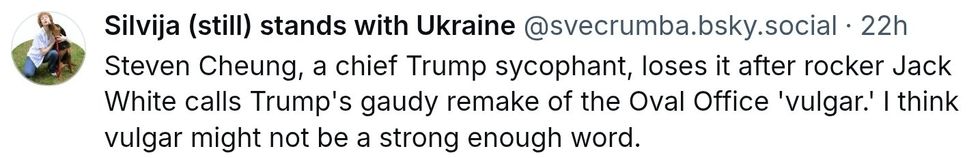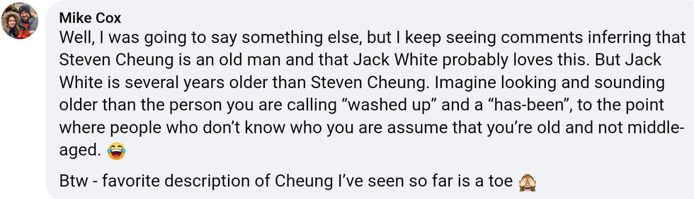 Cheung: "Jack White is a washed-up, has-been loser posting drivel on social media because he clearly has ample time on his hands due to his stalled career."Me: I believe someone's projecting his slovenly, orange boss onto Mr. White.