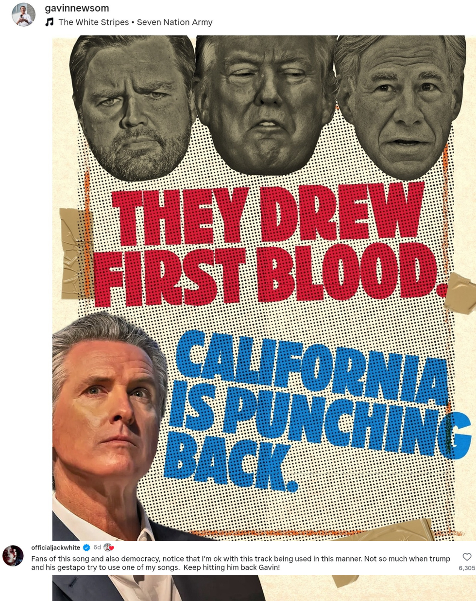 In August 2025, White gave his endorsement for California Democratic Governor Gavin Newsom to use "Seven Nation Army" to push back against Trump—whose name White never capitalizes.