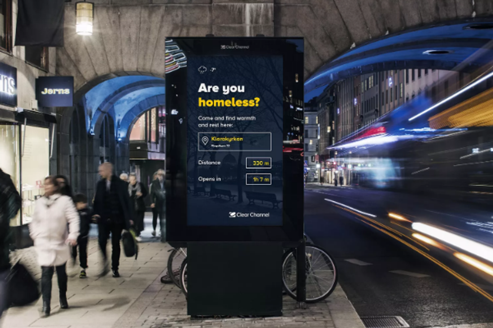 The billboards, the kind that you see on the streets and on the side of bus stops, will change their function during dangerously cold weather. When it is cold enough, the screens will display directions to the nearest shelter where homeless people can get out of the cold.