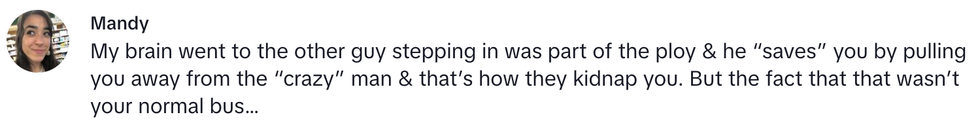 She then said in that moment she realized she was on the wrong bus because it wasn't slowing down to stop.