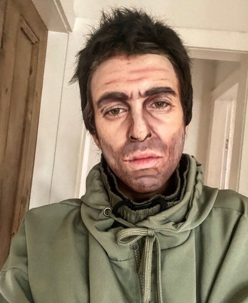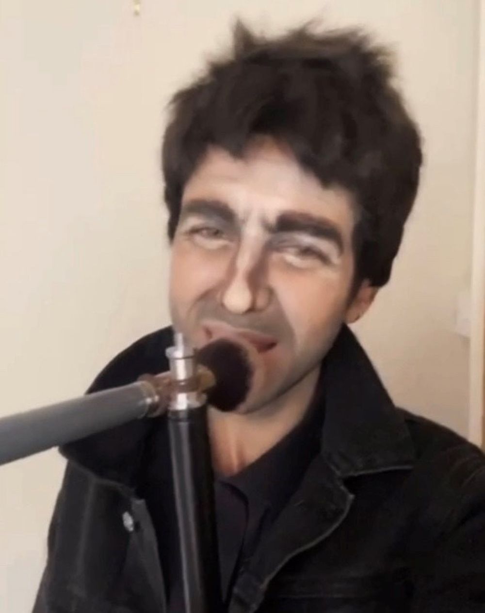 She also uses makeshift props to perfect her looks, including a pair of shorts draped over her shoulders to form Liam Gallagher's ubiquitous parka coat, and a blusher brush in place of a microphone for his brother Noel to sing into.