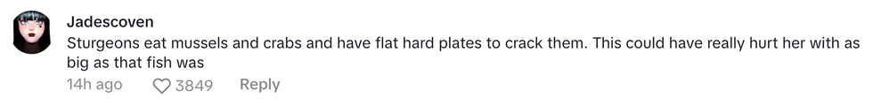 Sturgeons are fresh water fish and do not have teeth, so it wasn't really taking a bite out of her, but rather sucked her head into its mouth before spitting her back out again.