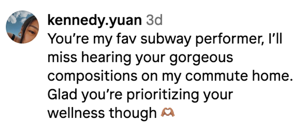 "As I stop subway performances, know that my passion for making music for you all is unwavering."