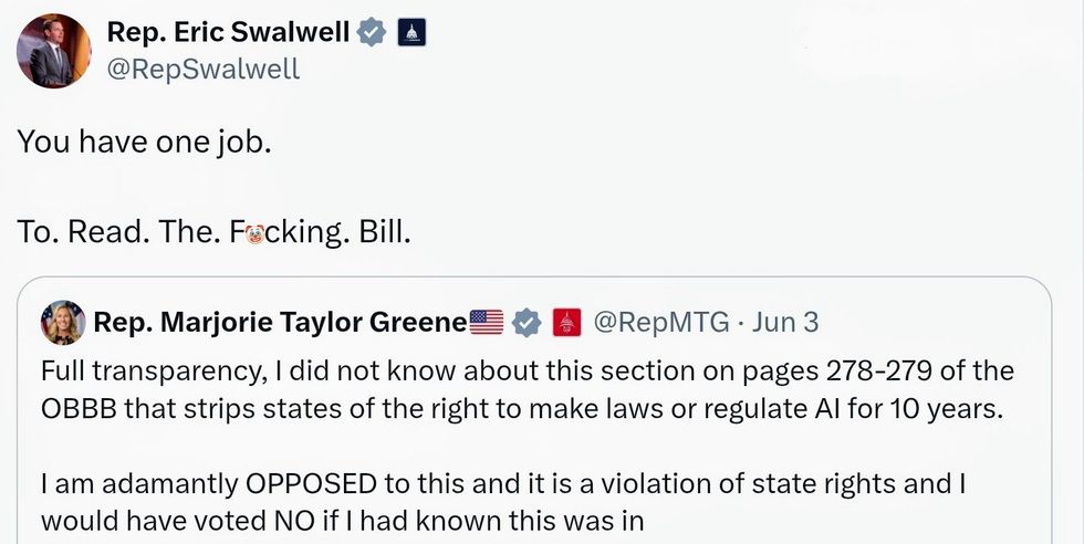 There is some irony to MTG's opposition to this part of the bill since she recently spent time arguing on X with Grok, Elon Musk's generative AI chatbot.