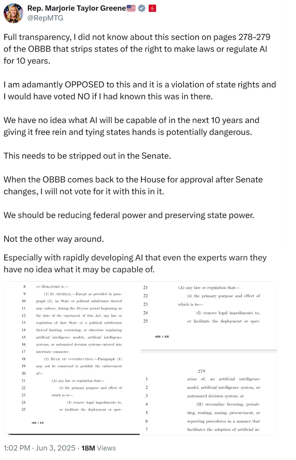 "Full transparency, I did not know about this section on pages 278-279 of the OBBB that strips states of the right to make laws or regulate AI for 10 years."
