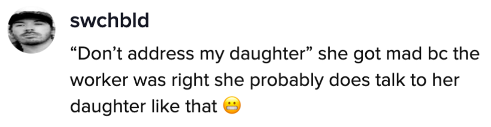 In what seemed to be a reference to abusive language Karen may have used earlier in the incident, the employee asked the woman's daughter, who looked to be in her teen years, "Does she talk to you like that?" The young woman just stared back, seeming shaken and unsure how to respond.