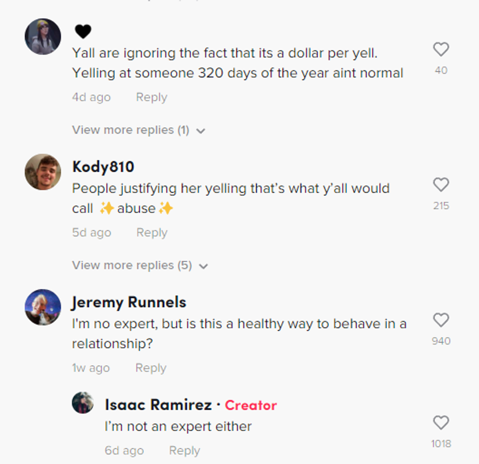 The comments again turned into a debate about whether this is a case of a verbally abusive fiancé, a petty and antagonistic content creator, both, or neither.
