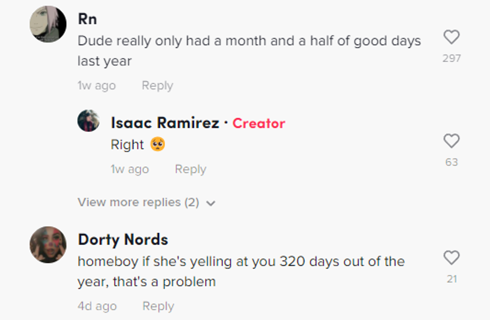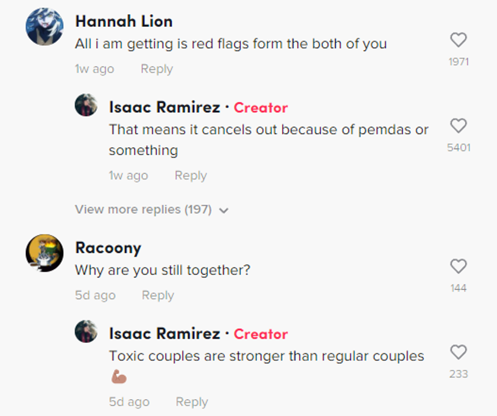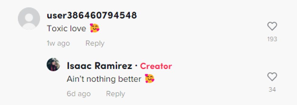 It's possible they're truly together and truly toxic. If they are, this TikTok user is wearing it as a badge of honor in the comments.