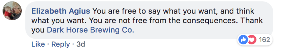 "This is the last thing that we thought we would have to post the day after Thanksgiving & we are extremely saddened that we would ever have to do so. It was brought to our attention that an employee made an intolerant post on his personal Social Media. As soon as we were made aware, he was immediately fired. We are appalled that one of our employees (dishwasher) posted this type of statement. He has since been terminated. Dark Horse Brewing Company will not tolerate this type of behavior & we are mortified that we have been associated by this repulsive act."
