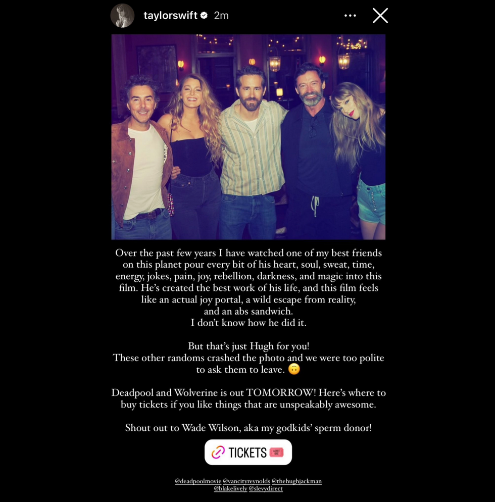 Swift concluded her post with a link to movie tickets and by acknowledging Reynolds' character, whose alter ego is Deadpool.