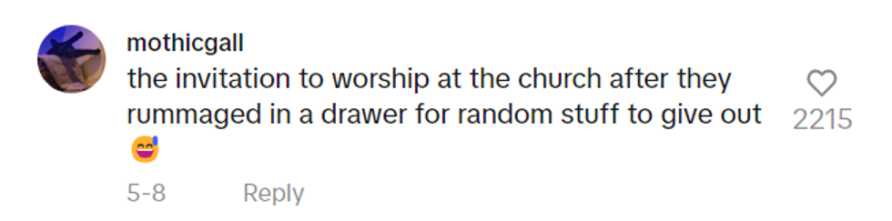 The gift bag largely seemed to be assembled from a welcome basket one might receive when visiting a church for the first time, including a plastic water bottle with the church's logo on it, a welcome card, and some single-wrapped candies.