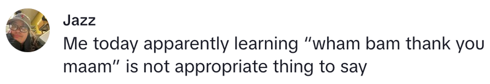 "I said, ‘Wham-bam, thank you ma’am,’ and they’re like, ‘Yeah, you shouldn’t say that, like, that doesn’t mean what you think it means.’”