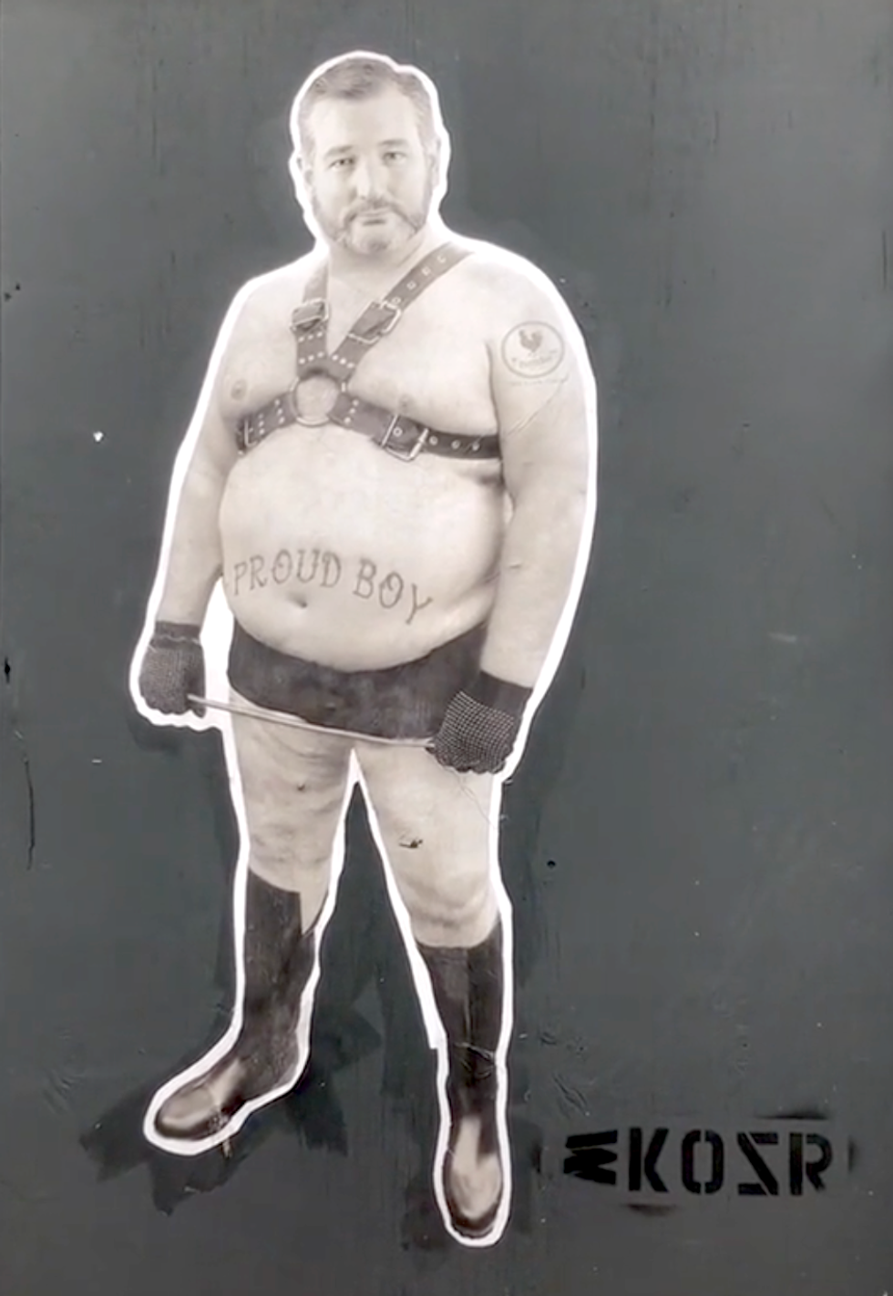 On Saturday, April 24, that horror was a giant wall sticker of Republican Senator Ted Cruz of Texas, naked except for BDSM gear with a PROUD BOY tattoo across his abdomen.