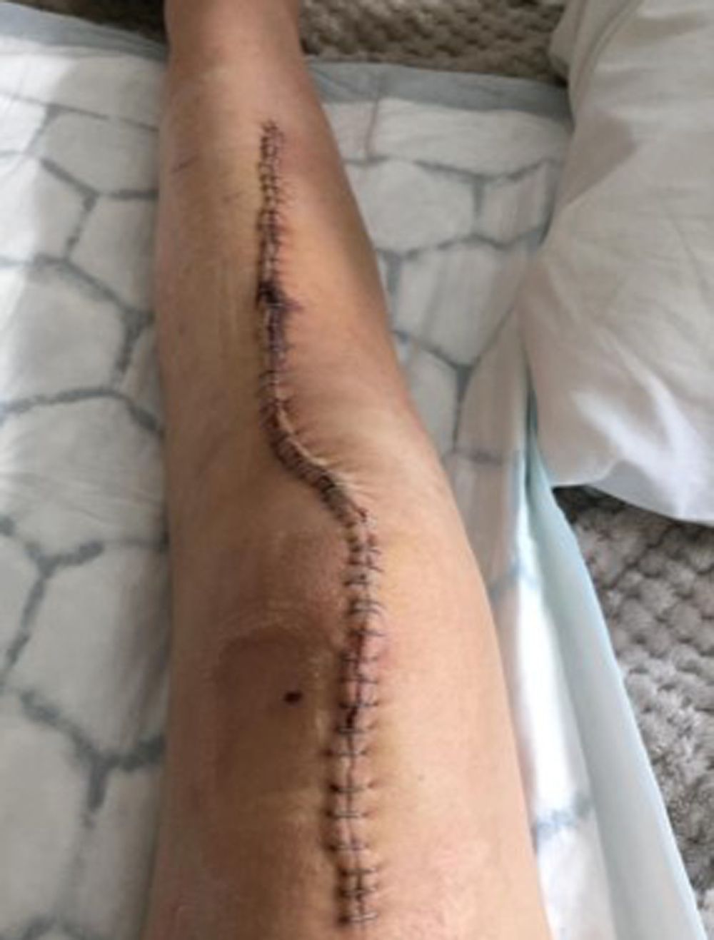 From there, she had skin grafts on both legs, using flesh from the back of her calves and buttocks to repair the damage, as well as anti-coagulant injections every day for the next year to prevent further clots.