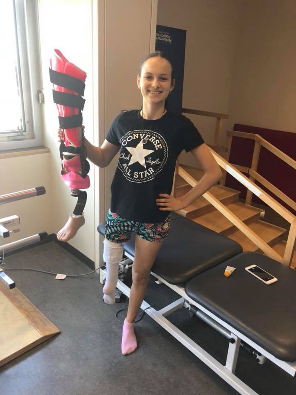 After first having intensive chemotherapy, Emma opted for rotationplasty over limb salvage surgery. Limb salvage surgery involved removing the affected bone and replacing it with a metal implant.