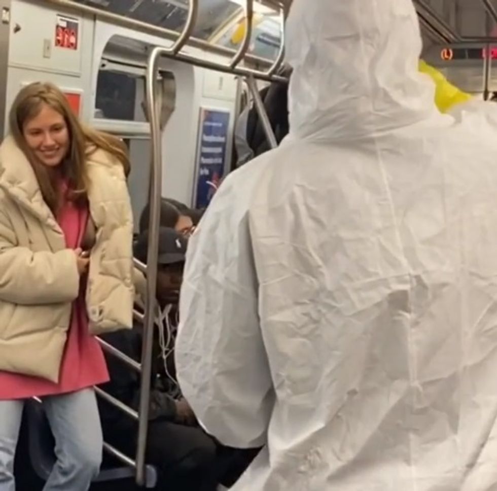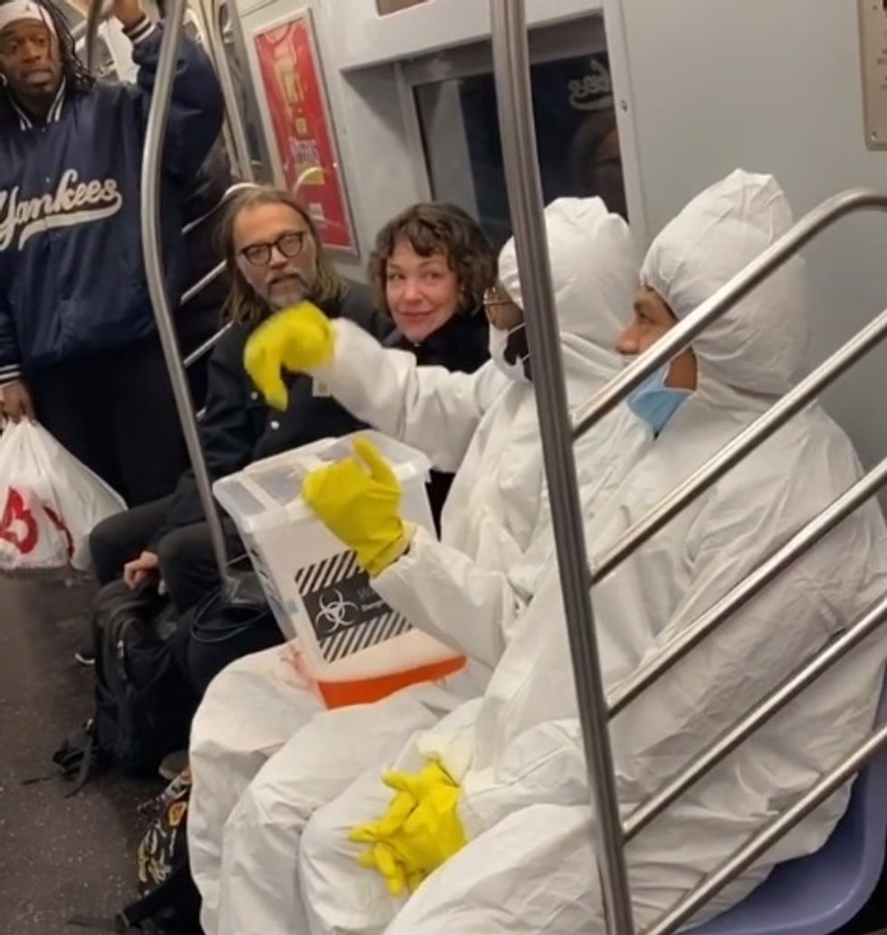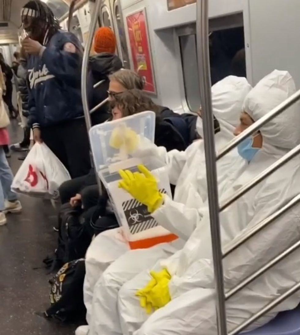 Before we talk too much about the reactions, though, let's talk about the prank itself. Two teens in full hazmat boarded the subway while carrying a clear container with reddish liquid inside.