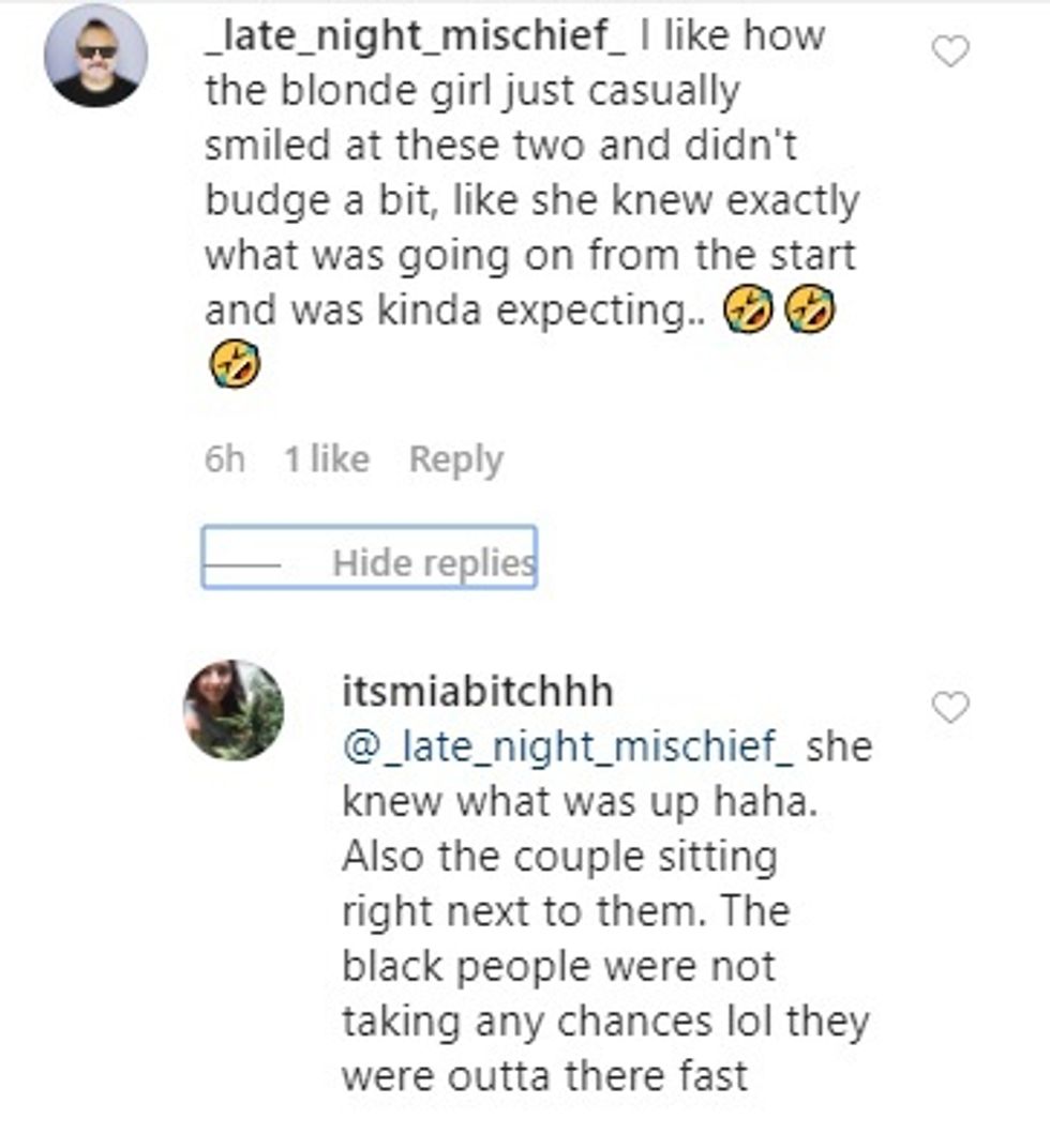 Interestingly, passengers further from the pair seemed more apt to freak out than those closer to the two. That's probably because they couldn't see just how not-Oscar-worthy the "fall" was.