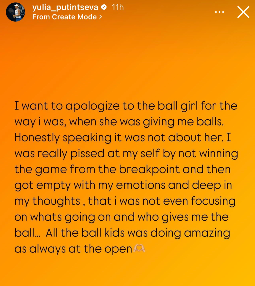 On Saturday, Putintseva issued a statement of apology on her Instagram story and chalked up her bizarre display to misdirected resentment.