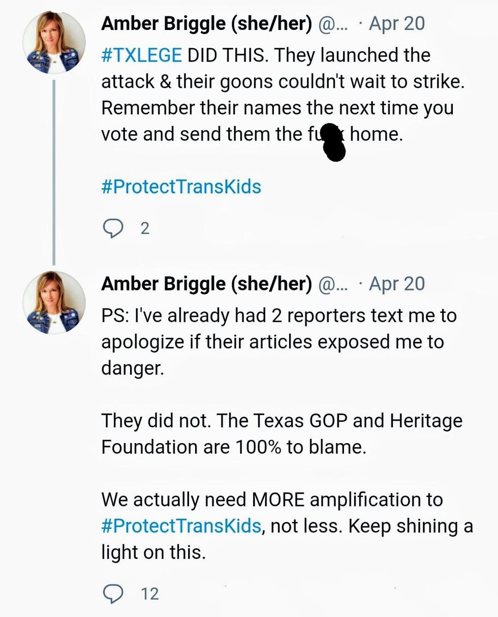Briggle urged people to continue to shine a light on transphobia and to remember the Texas legislature and lobbyists with the anti-LGBTQ+ Heritage Foundation was the real cause of the hate directed at her and trans children.