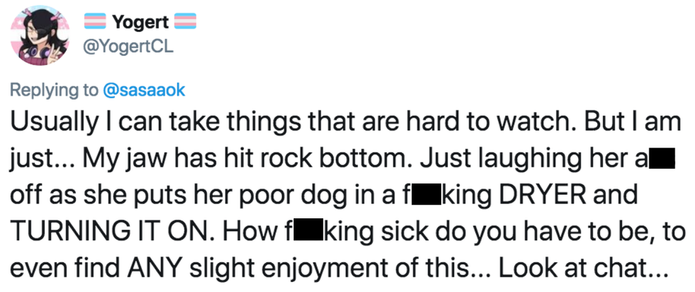 The teen in question told viewers, "I'm gonna do it. I'm gonna put his a** back in the dryer. He likes that sh*t!" before grabbing the dog and sticking him in the dryer as her viewers egged her on.