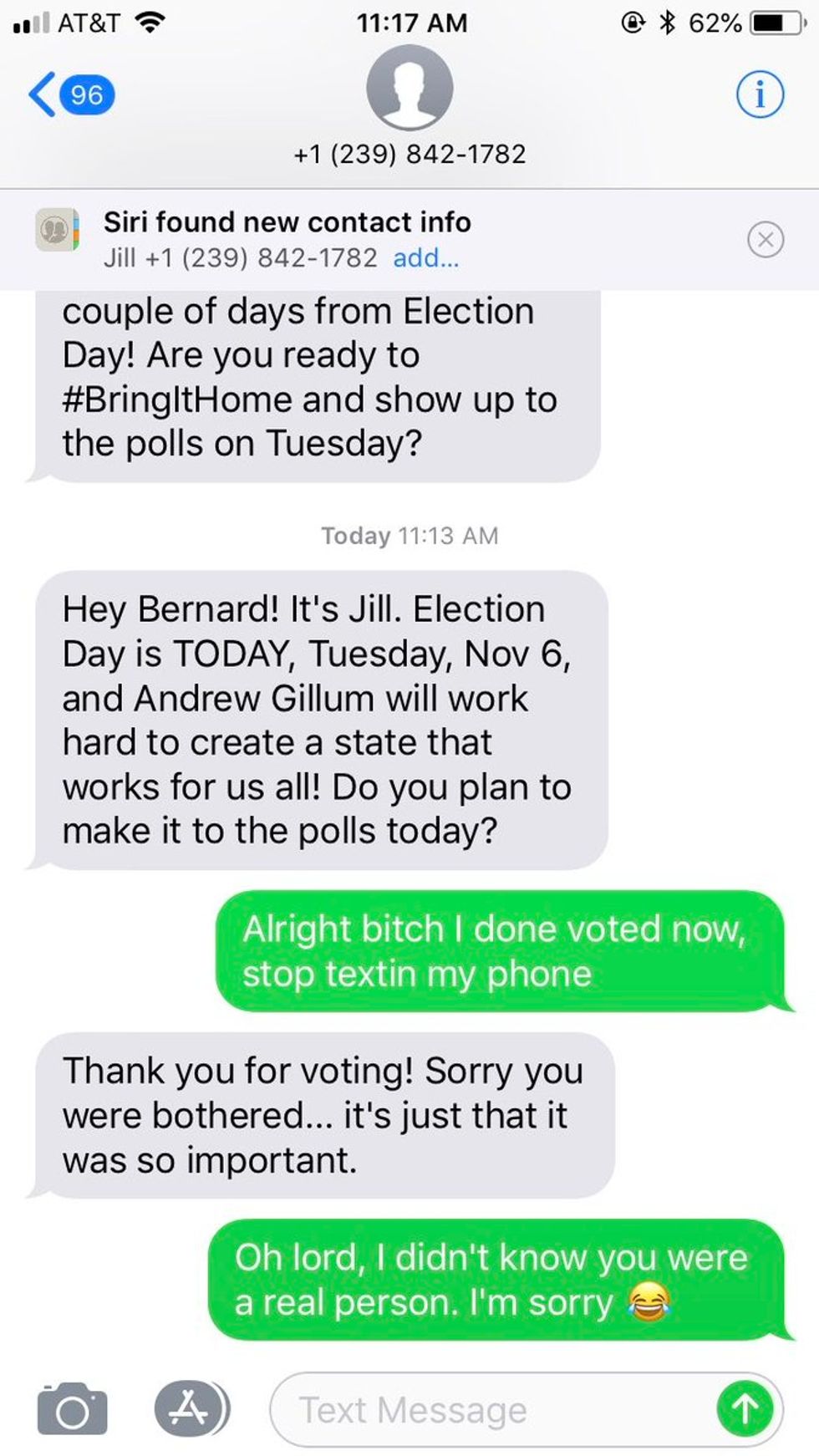 Bernard received numerous texts from the volunteers in the month leading up to the election, but he thought it was an automated system messaging him.