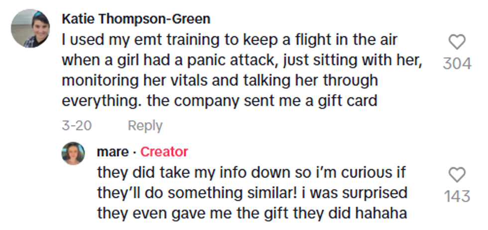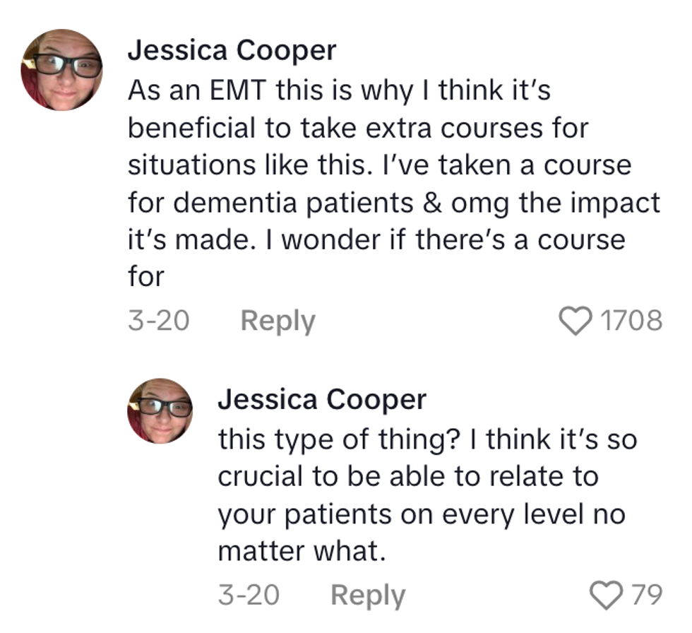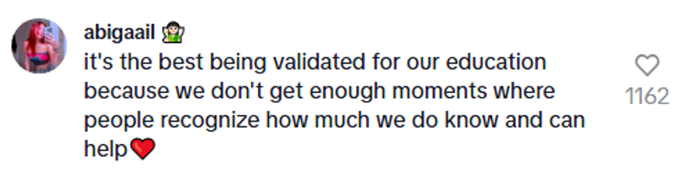 In response, she shared a little more about her education and the training that came after. While she hasn't been able to find a job in the field that paid enough to cover all of her expenses, she feels rewarded to be able to use what she knows during surprise moments like this.