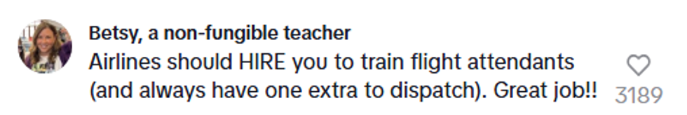 "Airlines should HIRE you to train flight attendants (and always have one extra to dispatch). Great job!"
