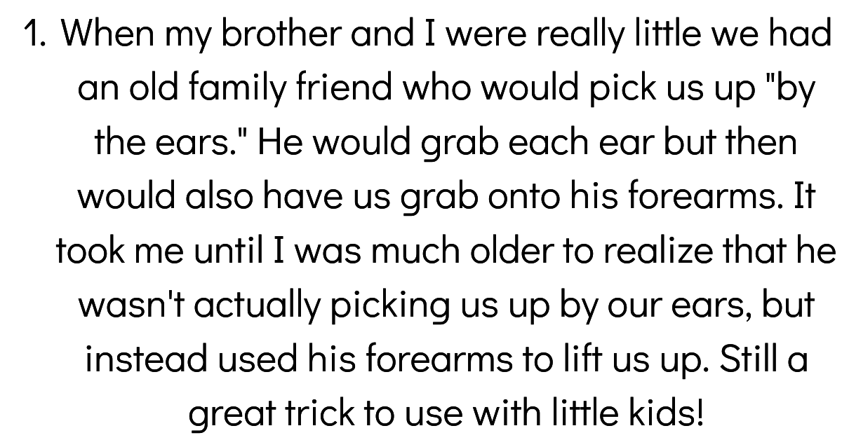 GiphyWhen my brother and I were really little we had an old family friend who would pick us up "by the ears." He would grab each ear but then would also have us grab onto his forearms. It took me until I was much older to realize that he wasn't actually picking us up by our ears, but instead used his forearms to lift us up. Still a great trick to use with little kids!