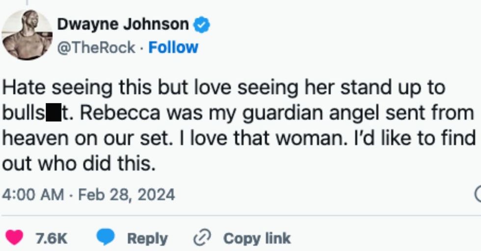 Dwayne "The Rock" Johnson is sticking up for fellow actor Rebecca Ferguson after she recently revealed an altercation with a costar.
