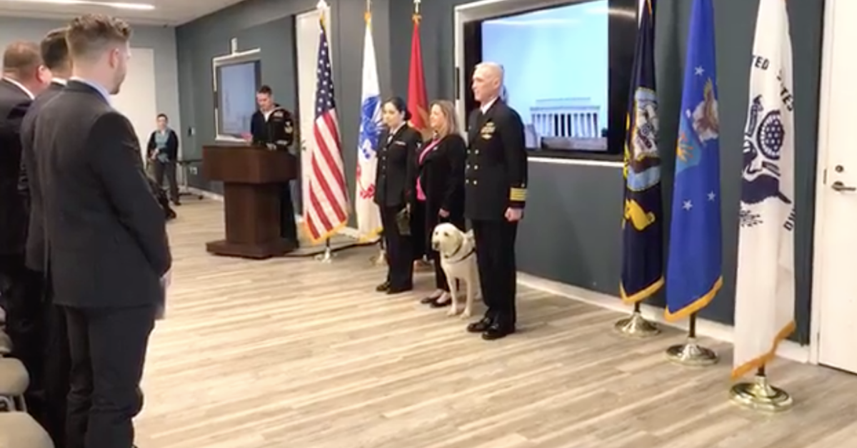 "Do you affirm or pant as a hospital corpsman in the United States Navy that you will support, comfort and cure warriors and their families, active duty and retired? That you embrace our staff and bear unconditional love and solace, especially on busy days? That you take this obligation freely, without any promise of treats or tummy rubs and that you will faithfully discharge the duties to provide joy, love and nurturing for our soldiers, sailors, airmen, Marines, and sailors and their families?"
